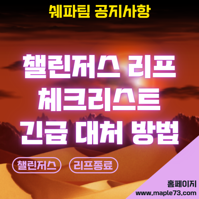 챌섭은 빠른 성장 기회를 제공하지만, 리프 규정과 일정을 정확히 이해하지 못하면 메소·아이템 손실 같은 큰 불이익을 볼 수 있습니다. 본문 체크리스트를 따라 사전 준비하고, 혹시 놓쳤을 경우 빠르게 대응하여 손실을 최소화하세요.